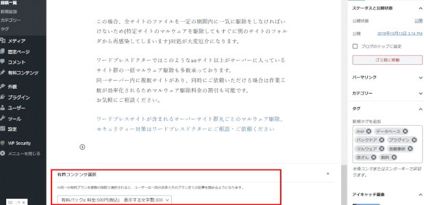2-3 有料にされたい投稿記事や、固定ページの編集画面の最下部より先ほど設定した有料コンテンツタイプを適応されてください。