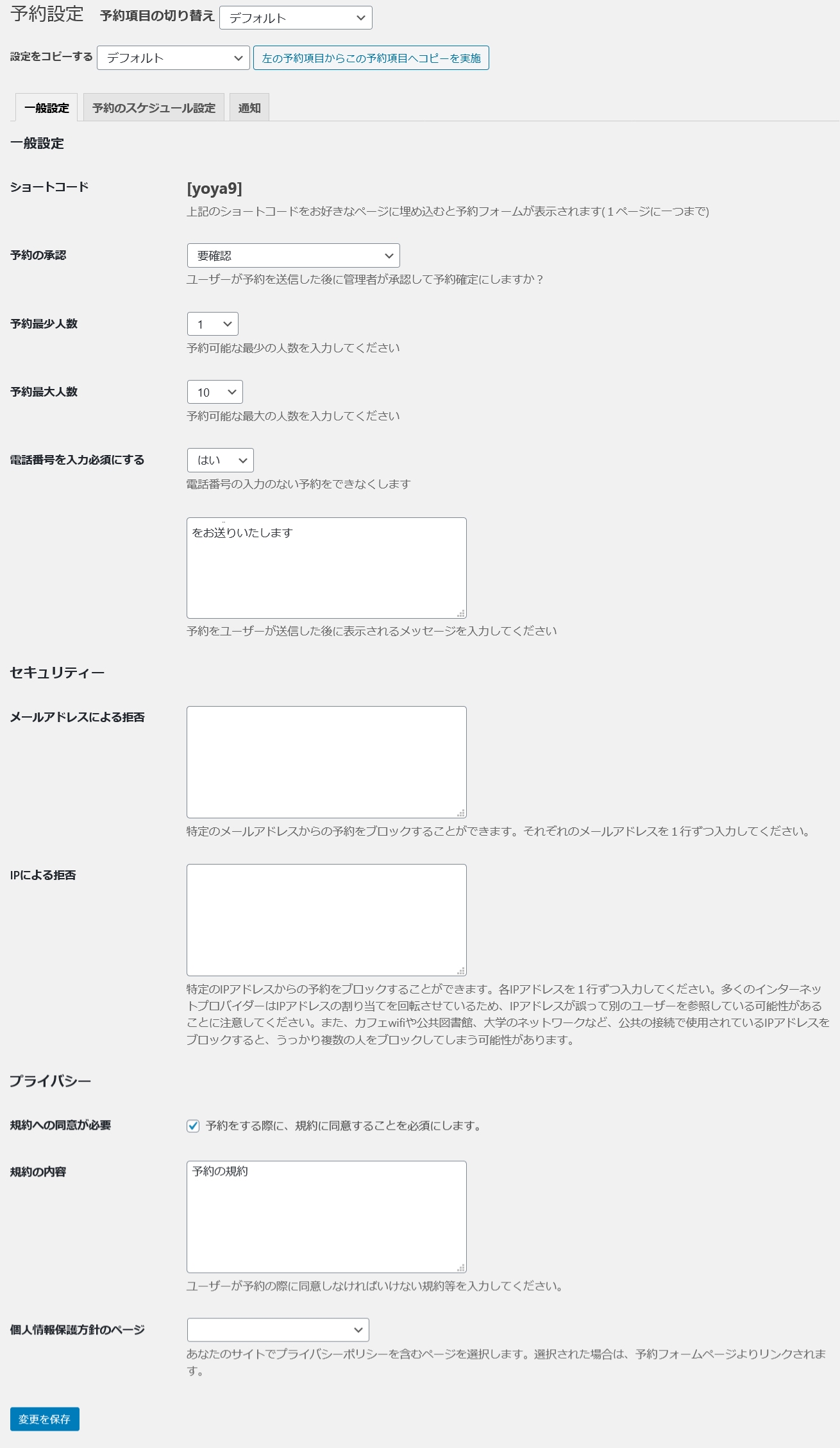 予約の最少人数や、最大人数などの設定が可能です。「予約完了メッセージ」は予約がユーザーによって送信された後にページ上に表示されるメッセージですので必ず設定するようにしてください。